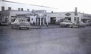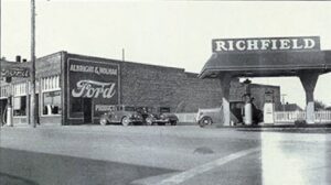 In 1937, an extensive remodel was done which doubled the size of their building.    The new main entrance now faced West Main Street.  In 1950, Charles H. Albright wanted to retire.  W. O. “Bill” Williams, and Ralph’s son, Paul Holman, bought Mr. Albright’s share of the dealership.  It was a three-way partnership, with Ralph owning one-half and Bill and Paul owning one-fourth each.  The name was changed to Holman-Williams Motor Company and they continued with the Ford Agency.  In August, 1966, they built a new building at 213 West Main Street.   This building now houses Wither’s Lumber Company.  In 1987, Mr. Williams died and in May, 1988, Paul Holman sold the dealership to Wayne Scott, who named his business Buckeroo Ford.  For 68 years, from 1920 to 1988, there had been someone by the name of Holman in the Ford dealership.