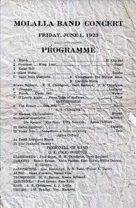 In June of 1923, the director was O. K. Cole.  Fred Bruce, H. H. Chingren and Derb Renhard played the clarinet.  Edwin Eyman, Alvin Purdue, Earl Nauertz, Willis Dunton and R. Garrett played the Cornet.   George Blatchford, E.R. Todd and Walter Taylor played the saxophone.  H. S. Harvey and Roscoe Hibbard played the trombone.  William Mackrell and I. F. Bradley played the drums.  The band male quartette included Roscoe Hibbard, H. H. Chindgren, Derb Renhard and A. B. Chindgren.  The band ladies quartette included Ida Kernon, Mae Hull, Effie Newman and Agnes Clifford.  Agnes Clifford also sang solo.   Oscar Franklin and Burrel Cole were altos.  Fred Eyman and Pete Kylo were baritones.  A. B. Chindgren and L. J. Little were bass.  Over time, other people who were in the band included:  Fred Bruce, Eskil Renhard, Don Bauer, Jack Cole,  Willis Dunton,  George Blatchford, Charles Kent, Ben Chindgren, Les Little and Paul Robbins.