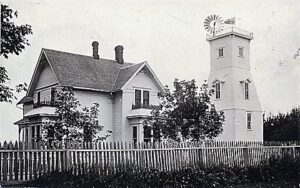 In 1877, when George was sixteen years old, he was apprenticed to a carpenter under the direction of his father, William D. Adams, who was a master carpenter.  In 1885, George purchased 180 acres of his father’s farm on Adams Road and changed his occupation to farming.  In 1886, he married Kate Robbins.  Kate was born in 1867, at Marquam, and was the daughter of Oliver and Mary Thompson Robbins.  Also, in 1886, George added 140 adjoining acres to his farm, which he purchased from N. G. Stewart.  By 1915, George had 220 acres under cultivation on his 320 acre farm.  In a newspaper article in the Enterprise Courier, Anniversary Edition of 1915, he is described as “a prosperous and progressive type rancher, who purchased thorough-bred stock.  He was raising hogs and had 50 head ready for market.  He had purchased registered Berkshire sows and was building up a herd.”  George also had purchased one of the “finest teams of draft horses in the Molalla district.”  They were Percheron and Morgan cross breeds and weighed approximately 1,800 pounds each.  On the farm, George and Kate also had an outstanding residence which, today, is a Clackamas County Landmark.  It was built in the Queen Anne Style and included a windmill enclosed by an atttractive wooden tower structure.  George and Kate had three daughters:  Bertha, Edna and Ofa.