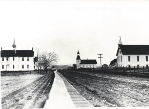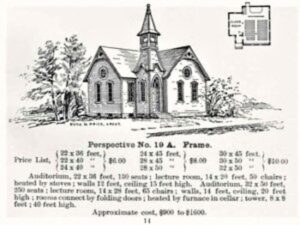 On March 26, 1906, the Board of Trustees of the Molalla Methodist Episcopal Church held their first meeting to plan the new church. It was held at Mackrell’s Harness Shop at 3 p.m. and was called to order by Rev. Henry Spiess, Pastor of the church. Attending were W. P. Herman, President of the Board, Oliver Willard Robbins, Secretary and Dr. J. J. Leavitt, Treasurer. In the next six months, these four men made most of the decisions regarding building the church. They discussed the plan to build the church on a 66’ x 120’ lot. The plan was selected from the 1904 Catalogue of Church Plans by architects Benjamin D. and Max Charles Price. It was Plan No. 3, size 24’ X 40’, under Perspective No 19A. The men met once a month for several years but, it appears, that the main part of the church was finished by the middle of 1907.