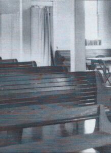 At the October 1st meeting, the secretary was instructed to make sure that all the bills of lumber were delivered and paid for. The Secretary “reported that the west side of the roof was on the new church”. He also ordered “ground strips for plaster” for the interior walls and “procured galvanized iron for valley gutters, rain conductors and a deck for the tower and a vane for the top of the tower”. Robbins Bros. Store was ordering doors, windows, molding and shingles for finishing the building.